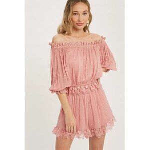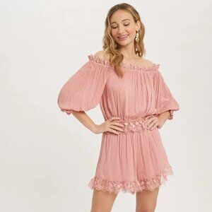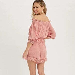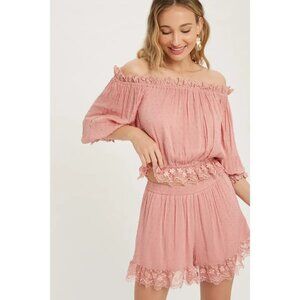 Stay stylish and comfortable in our Lace Trim Lounge Set. Made with soft, luxurious fabric and delicate lace detailing. Perfect for lounging at home or can also be worn as separates for running errands. A woven lounge set featuring a textured material with lace detailing, off the shoulder top & high waist shorts, relaxed fit.