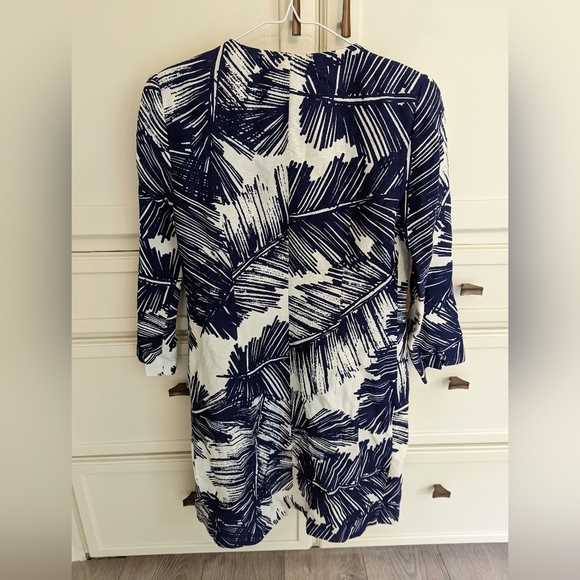 Stunning blue feather patterned lightweight coat with jewels along the neckline. Has inner lining and pockets which are still stitched closed because I only wore it once! Weight and thickness is like a blazer.