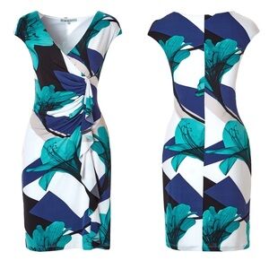 CLEO PETITES Floral Flutter Trim Dress With V Cut & Cap Sleeves Teal/Blue Small
