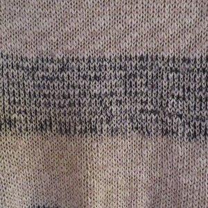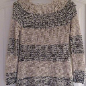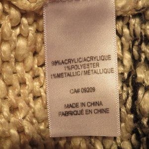 Cleo Petites sweater, oatmeal colour with wide black bands, and a gold colour metallic glint throughout. Loose weave and see-through, 98% Acrylic, 1% Polyester, 1% Metallic. Hand Wash, Dry Flat. Made in China. Measurements (with garment laid flat) Bust - 18", Sleeve - 16", Length - 29".