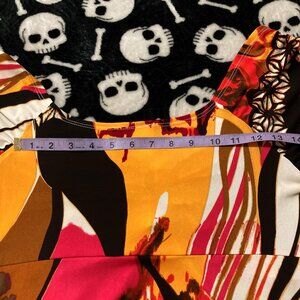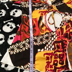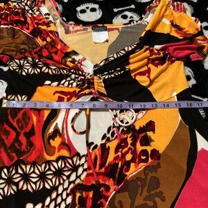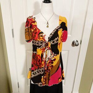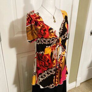 Highlights include ruching on the sleeves coupled with adjustable ruching at the bust, a fluttery ("lettuce") hem, lovely v-neckline, and the fabulous all-over print of flowers, animal (cheetah/leopard), and an abstract design of lines and splotches all rendered in shades of white, cerise pink, saffron/mustard yellow, and brown. ๐ฉท๐๐ค๐