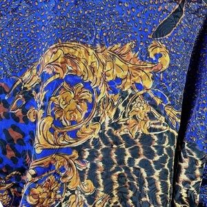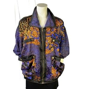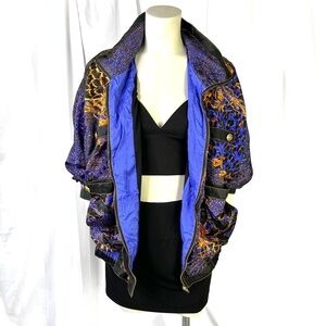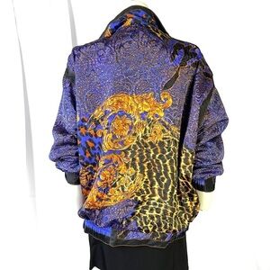 Unleash your wild side with this vintage Clipper Bay Blue and Yellow elastic waistband drop shoulders Windbreaker Jacket. Featuring animal prints on a vibrant blue backdrop, adorned with gold leaf prints and buttons, this oversized women's jacket in a medium size is a statement piece that demands attention. The front zipper ensures convenience, while the fully lined interior provides comfort. Embrace the retro aesthetic and make a bold fashion statement with this unique vintage windbreaker. Shop now and add a touch of vibrant nostalgia to your wardrobe!