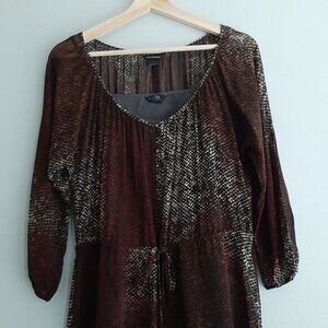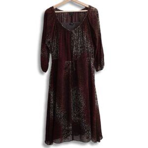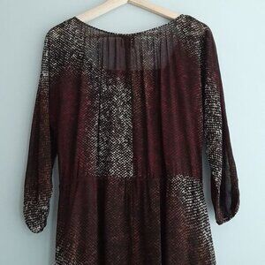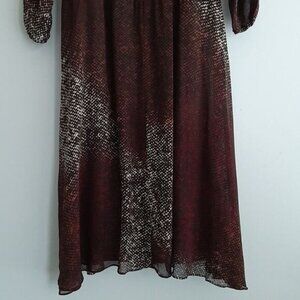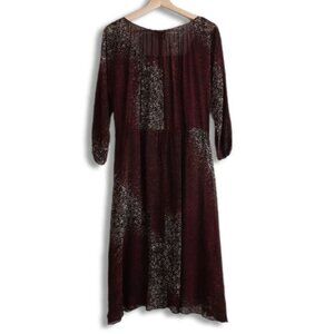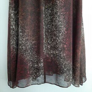 • Semi sheer 3/4 sleeve scoop neck midi dress in burgundy red, black and cream abstract snake skin / reptile print. Fully lined (removable slip).
