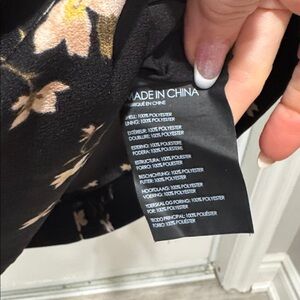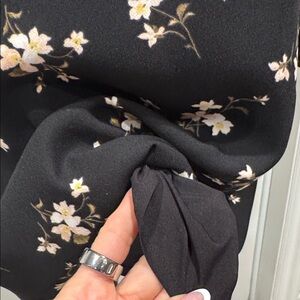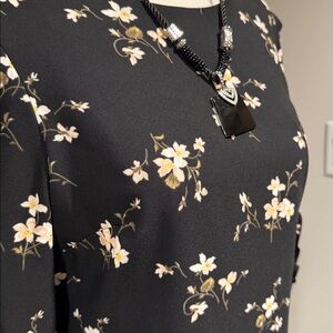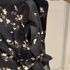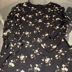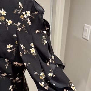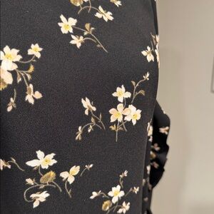 Chic black dress with floral print. Features long sleeves with ruffle detail. Ideal for stylish outings. Great for all 4 seasons. Fully lined, full back invisible zipper. Alluring opening at shoulders but not too much!Darts at bust. P2P 16” Shoulder to hem 33”. 15” flat at narrowest point at waist.