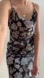 Draped V-neckline; spaghetti straps; side slit; concealed back zip closure; floral pattern
