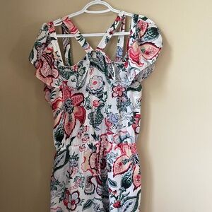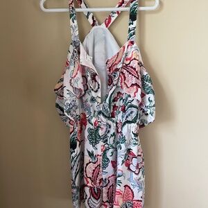 CLUB MONACO ROMPER, SIZE 10, FLOWER MOTIF, CRISS CROSS STRAPS WITH OFF-THE-SHOULDER RUFFLES. Back zipper. In new condition.