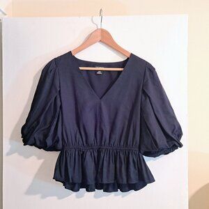 In like-new condition. Softly structured balloon sleeved peplum top with an elastic waist. Pullover style. 100% Lyocell shell, recycled polyester lining. Measures 19.5 pit to pit, 13.5 across waistband (unstretched), 15 inches shoulder to waist, 5 inches fabric below waistband to hem.