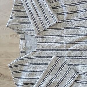 Elevate your casual wardrobe with the CLUB Monaco Lilani Pullover Top in a comfortable and stylish design, available in size XS. This pullover top is the perfect blend of comfort and fashion. It features a chic gray striped pattern that adds a touch of sophistication to your look. The kangaroo pocket adds both style and functionality, making it ideal for casual outings. With long sleeves, it's suitable for year-round wear. The fabric content comprises 66% cotton, 29% polyester, and 5% elastane, ensuring both comfort and durability. Rest assured, this top is in excellent condition with no stains or tears.