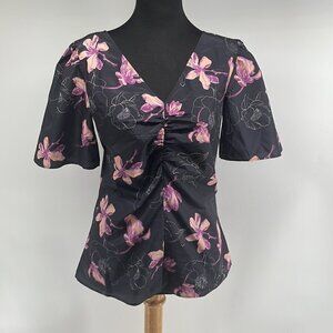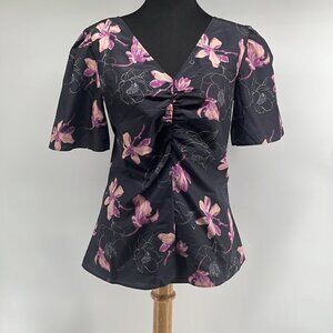 CLUB Monaco NWT Ruched Flutter Sleeve Top floral career shirt sz small