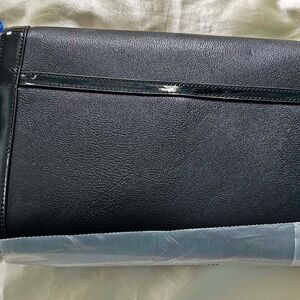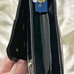 CLUTCH, ANNE KLEIN, BLACK, WITH GOLD TONE METAL STUDS, PATENT ACCENTS, SHOULDER STRAP WITH CHAIN, POCKETS, TAGS ON, NEW NEVER USED, NO DAMAGE