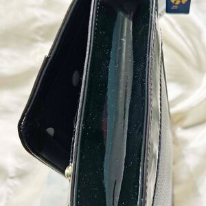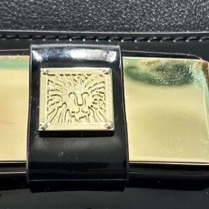 CLUTCH, ANNE KLEIN, BLACK, WITH GOLD TONE METAL STUDS, PATENT ACCENTS, SHOULDER