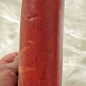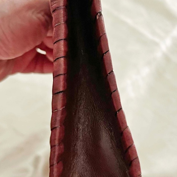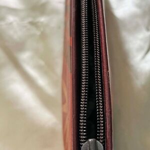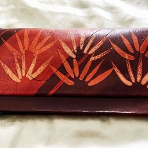CLUTCH HANDCRAFTED IN BRAZIL, LEATHER, LOST WAX METHOD, ONE OF A KIND, RED/PLUM MIX, HAS POCKETS, ZIP TOP CLOSURE, TAGS ON NEW NEVER USED, NO DAMAGE
