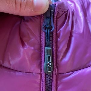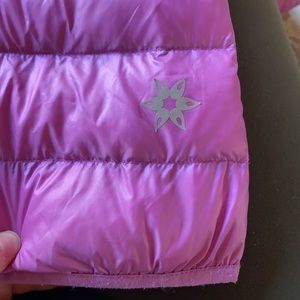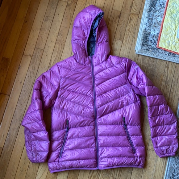 Worn twice! Pristine condition down puffer jacket. Very warm, extremely lightweight and packable. Pink exterior, grey interior. 100% fill.