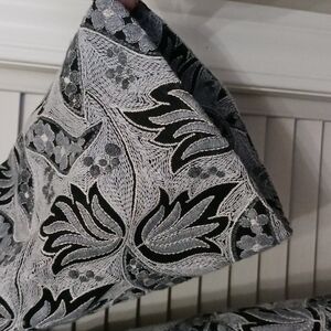 Monochromatic color scheme in shades of gray and black. Intricate all-over floral embroidery. Luxury designer quality piece.