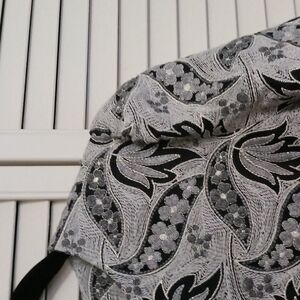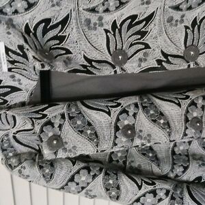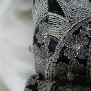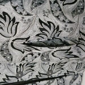 Monochromatic color scheme in shades of gray and black. Intricate all-over floral embroidery. Luxury designer quality piece.