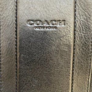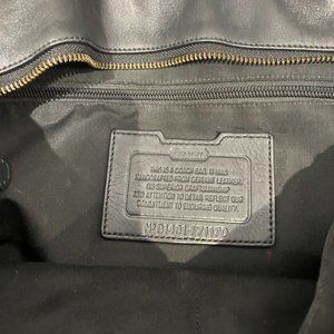 A gorgeous black genuine leather Coach tote bag with brass hardware (stamped Coach). Two handles and one flexible nylon strap for shoulder or cross body use. Zipper close. No exterior pockets. Interior has various sized pockets including one with a zipper.