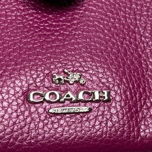 The bag's sleek pebbled leather exterior is complemented by a matching lighter purple lining, enhancing its aesthetic. Silver hardware accents provide a subtle contrast, alongside the iconic Coach logo and bag charm for an authentic finish. Whether you're headed to the office, out for a casual event, or dressing up for a cocktail party, this versatile accessory is tailored for any occasion.