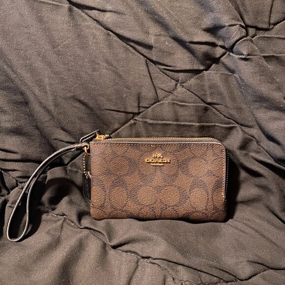 Y2K era discontinued coach wristlet. Coach double corner zip signature coated canvas and recycled leather