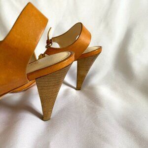 COACH GENESIS CAMEL BROWN LEATHER T-STRAPS SANDALS, this is a neutral cone heel leather t-strap sandals from coach featuring a metallic engraved strap part with ring on the front - adjustable ankle buckle fastening - open to - sling back - two-toned in neutral palette for a modern trendy touch - summer favorite from cocktail to chic boho / trip / vacation night out.