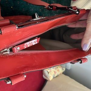 The Coach logo is embossed in the leather making it not super obvious. This was a plus for me. Stored in dust bag. There is a slight discoloration on the back near the bottom, hardly noticeable. Few pen marks on the bottom of the lining. The handles are sturdy, patent on the outside and matte leather on the underside. Handle length is adjustable. Side snaps open for more room. Zip closure for added security.