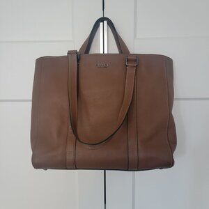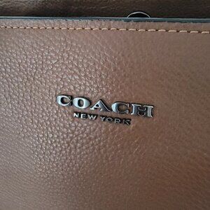 Brown Leather COACH tote with double handles (short and long) perfect for hand-held or over-the-shoulder use. With gun metal hardware. It has been kept in the dust bag and sitting upright in a closet drawer. (bag not included because if price reduction) Time for someone else to actually use it. Has inside pockets and one outside one that fits a larger smartphone perfectly. Used less than 5 times to work.