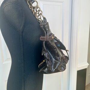 This authentic Coach Legacy Garcia Hobo Bag is gorgeous. It is a beautiful brown colour in patent leather and suede. The hardware is brass coloured. This bag has a front pocket that has a turn lock. Behind the front pocket is a slot for essentials. The interior of this purse has a satin lining. There are pockets on the interior to store essential items you do not want falling to the bottom of the bag. This bag has a zipper for closure, keeping your wallet and items safe and secure. This beautiful and luxurious bag is in excellent condition. There are two straps made of brass chain link and patent leather. The dimensions of this purse are: Length- 14.5” Height- 10” Width- 6.5” Strap length- 22”.