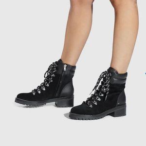 A sophisticated reimagining of rugged combat boots, this lace-up Lorren bootie is crafted of water-resistant suede and leather. Edged with a polished curb chain for a touch of shine, it has a durable lug sole for increased traction.