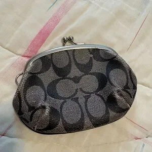 Elegant Coach pouch with signature monogram. Features black and white design. Ideal for small essentials.