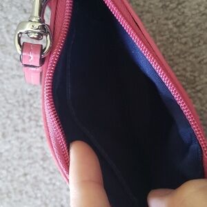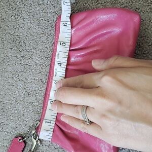 You are viewing a COACH pleated medium wristlet purse. Comes in hot pink textured leather pattern, silver-tone hardware, pink accents, navy blue lining, one inner slip pocket. Size: 4.5" H x 7" L x 1" D. Wristlet loop strap.