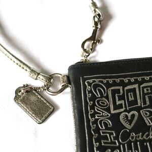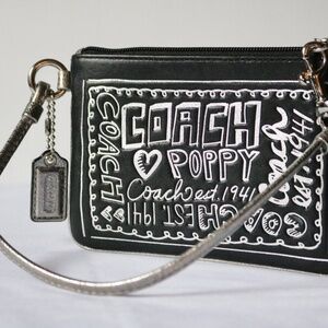 Coach Poppy leather wristlet in black with silver graffiti style writing on front. Zippered closure with silver handle that features Coach tag. Approximate measurements: height = 4", width = 6". Pre-owned but in excellent condition. NOTE: there is a tiny bit of wear on the handle as can be seen in last picture, but not noticeable. Smoke-free, pet friendly home!
