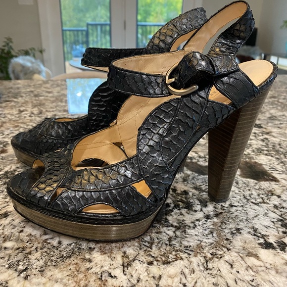 Sexy animal print heels, worn a few times and in great condition, aside from slightly scuffed bottoms. Heels are approximately 5” with a 1” platform. Round toe, curvy straps and a stacked wooden heel with adjustable ankle strap. They’re made of genuine leather with a python pattern and snakeskin texture. Make me an offer !!