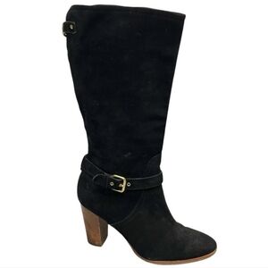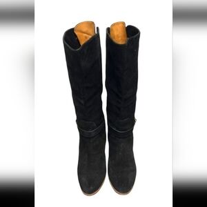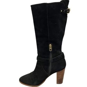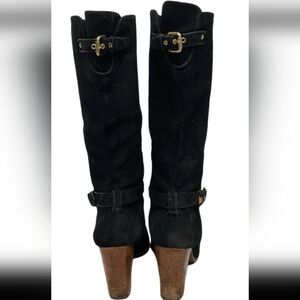 Beautiful black soft suede Coach boots. Inside half zipper which makes putting these on so easy. Buckles at thr top for looser or tighter fit.