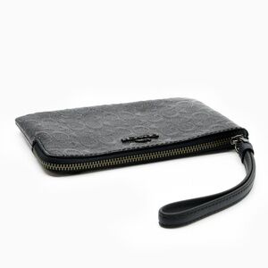 Details: Embossed leather, Zipper closure, Attached wrist strap, Metal Coach logo at front, 2 credit card slots at interior