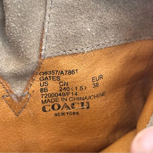 Elevate your style with these Coach Gates Moto combat boots. Crafted with a warm gray suede upper material, these boots are perfect for any occasion. The studded accents add a touch of edginess to the overall design. The combat style and character of the boots make them perfect for any adventure. The brand Coach is known for its quality and these boots are no exception. Make a statement with these boots and step out in style. Edgy and trendy. Biker vibes.