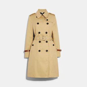 The double-breasted silhouette with leather bracelets at cuffs pays homage to heritage design. Made with 68% cotton and 32% polyester, it is lined with 100% polyester for quality. Features include a button closure, button pockets, and an adjustable belt at the waist for a customized fit. Its water-resistant design ensures versatile wear in various weather conditions. The length is 38 1/2 inches, and it requires dry cleaning for care maintenance. Runs small.
