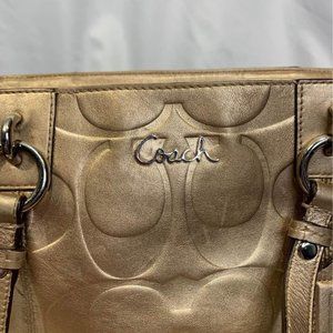 COACH gold handbag. Purple lining. Embedded coach logo. Big outside pock…