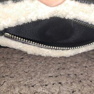 This small rectangular bag features a zip closure, black hardware accents, and a pebbled leather exterior with off-white shearling details.