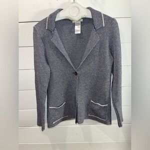 Elegant knit blazer in navy and white with subtle silver thread woven throughout, giving it a refined shimmer. Features a single-button closure, notched lapel collar, and front patch pockets with contrasting trim. A versatile jacket that blends structure with comfort — perfect for office wear, layering, or elevating a casual look.