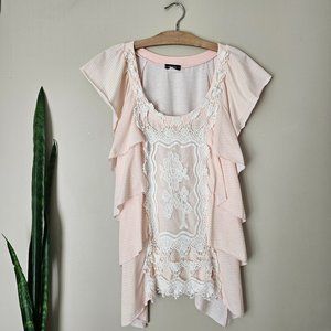 COCOMO | Peach & White Striped Short Sleeve Top with Lace Detail