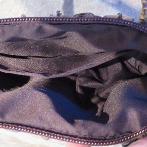 Gorgeous handbag, brown fabric base embellished all over with polished coconut shell pieces, and abalone / paua shell pieces in a deep V design on the front. All shell pieces are loosely attached with beads so that they move. Has one small pocket in lined interior, and top zip. Handles are made of woven strands of small shells. No maker's mark - zip says GSL. Handbag weighs 484 grams. Would be great for an evening bag as well as day use!