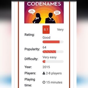 Codenames can be played by 2 till 8 players. The game rules are very easy to learn. It's set up in less than a minute and the average game takes about 15 minutes. The game mechanics are fantastic as it allow anyone to jump right into the mid-game.