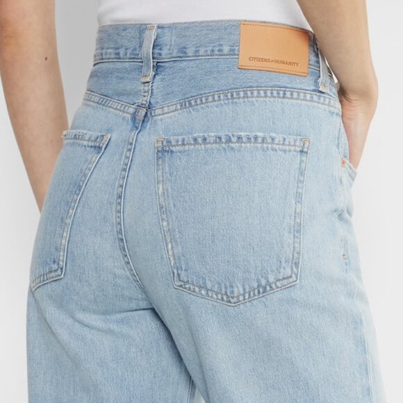 These are high-rise jeans with an easy-fitting top block and an ultra-relaxed wide leg. They’re cut from non-stretch 100% regenerative cotton denim. These ones come in a medium indigo wash with fading and whiskering.
