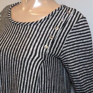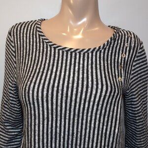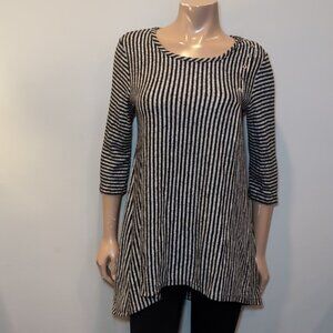 COIN 1804 Striped Tunic Top Cropped Long Sleeve Asymmetric Hem Button Accent