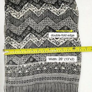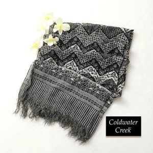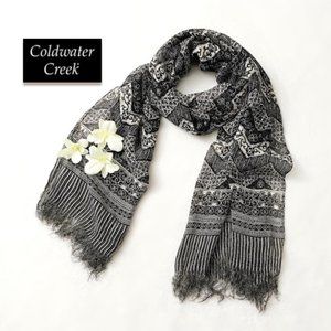 COLDWATER CREEK 100% Pure Silk Scarf Wrap, Rectangle Long Scarf with Geometric Floral Print in Black, Off-white and Grey colors. Cute and fine tassels on both ends.