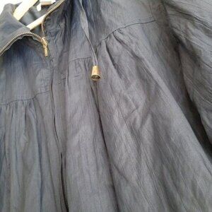 • Long 3/4 sleeve crinkle fabric A-line jacket with full zipper closure and two front pockets in navy blue.