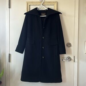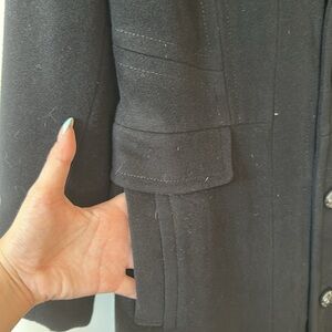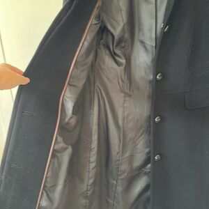 This sophisticated black trench coat from Cole Haan features a timeless design with a notched lapel and a structured silhouette. Crafted for both professional and casual settings, it offers a classic look that never goes out of style.