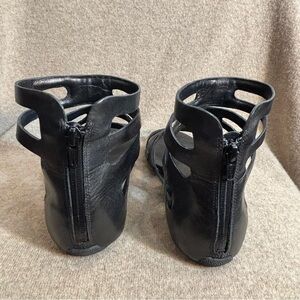 COLE HAAN NIKE Sz 9.5B Gladiator Stylish Black Strappy Sandals Flats Zipper Back. Leather. Elevate your look with these chic black strappy sandals. Perfect for any occasion, these shoes offer both style and comfort. Dress up or down.