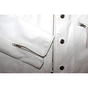 This white leather jacket is a true gem for anyone looking to add a unique and edgy piece to their wardrobe. Featuring a slim-fit design that contours to the body, this jacket is labeled a Medium but may be closer to a Small due to its tailored cut. It’s made from genuine leather and lined with soft polyester for a comfortable fit. With a zip-up closure accompanied by stylish button accents and zipper pockets on the front, this jacket brings a sleek, modern twist to classic leather outerwear. The jacket also features zippered cuffs, adding an extra touch of flair, and a collar design that exudes understated elegance.