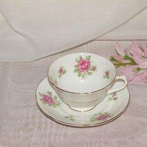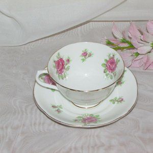 Pretty, floral bone china cup & saucer by Collingwoods. Made in England. White with pink flowers and gold rim.