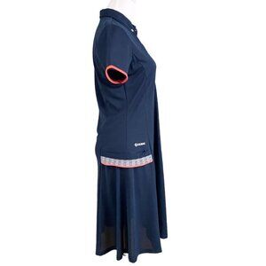 COLMAR NAVY ORANGE TRIM SHORT SLEEVE BLACK WHITE ARGYLE POCKET DETAIL DRESS, this is a the perfect preppy tennis athleisure dress in a navy color - flutter a-line / skater style with short sleeve - button up on the upper bodice - orance contrast trim on hemline and pockets - black and white argyle pattern pocket detail -zipped front pockets - lighweight - breezy- breathable - cllared -slightly seethrough - unlined -summer or indoor favorite with sneakers, sandals or flats.